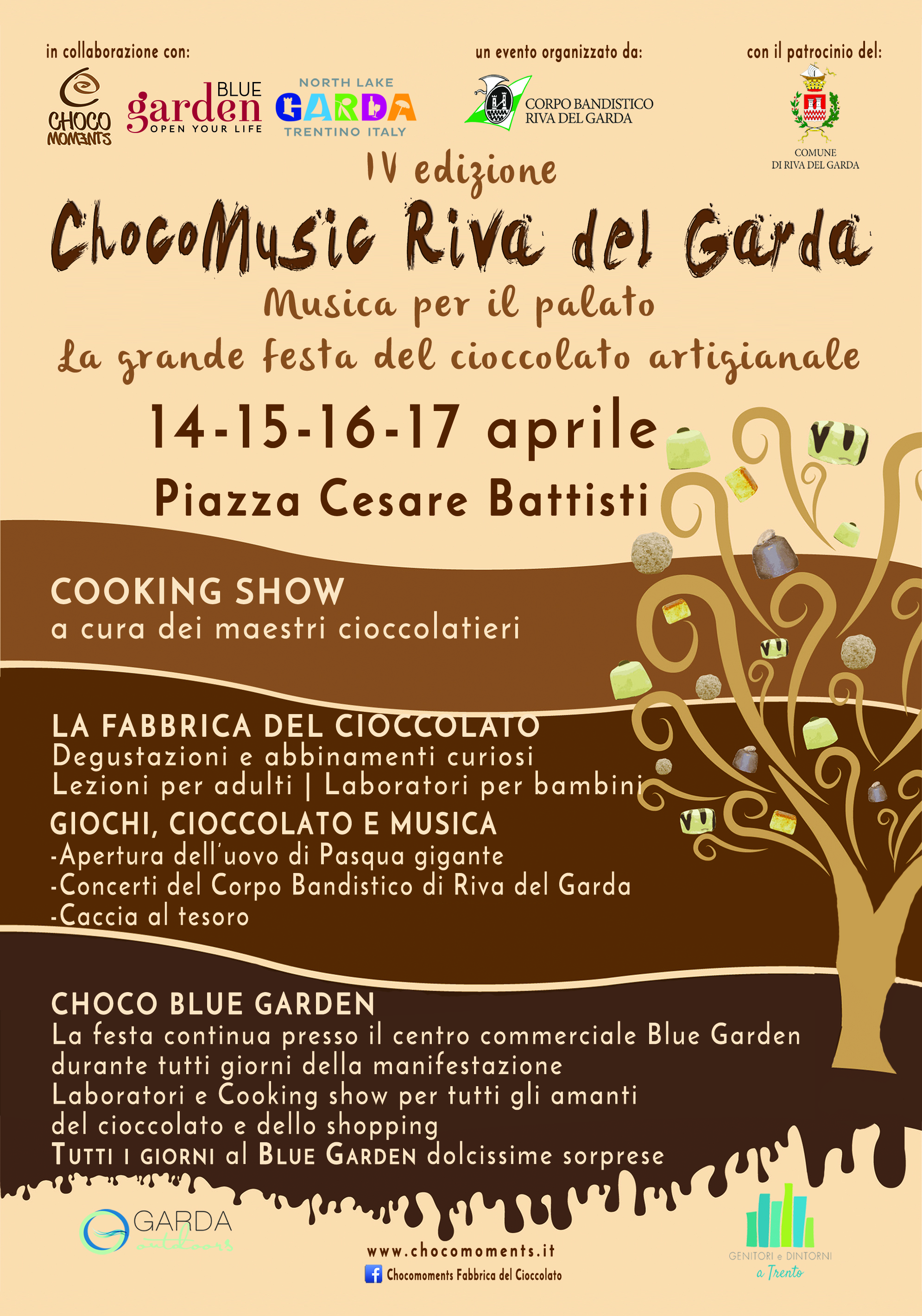 Musica, ballo e sapori, la magia delle note sposa il gusto - Chocomusic è un evento unico grazie anche al particolare abbinamento tra cioccolato e piacere della musica, attraverso la singolare e accattivante fusione tra note e sapori con una serie di concerti in piazza. Il Corpo bandistico Riva del Garda e i suoi gruppi da camera e di musica moderna accompagneranno con un sottofondo musicale le delizie riservate al palato, a Pasquetta lo spettacolo dell’Accademia di danza e ballo Roncher, esibizioni hip-hop, danza moderna e balli da sala animeranno la piazza.