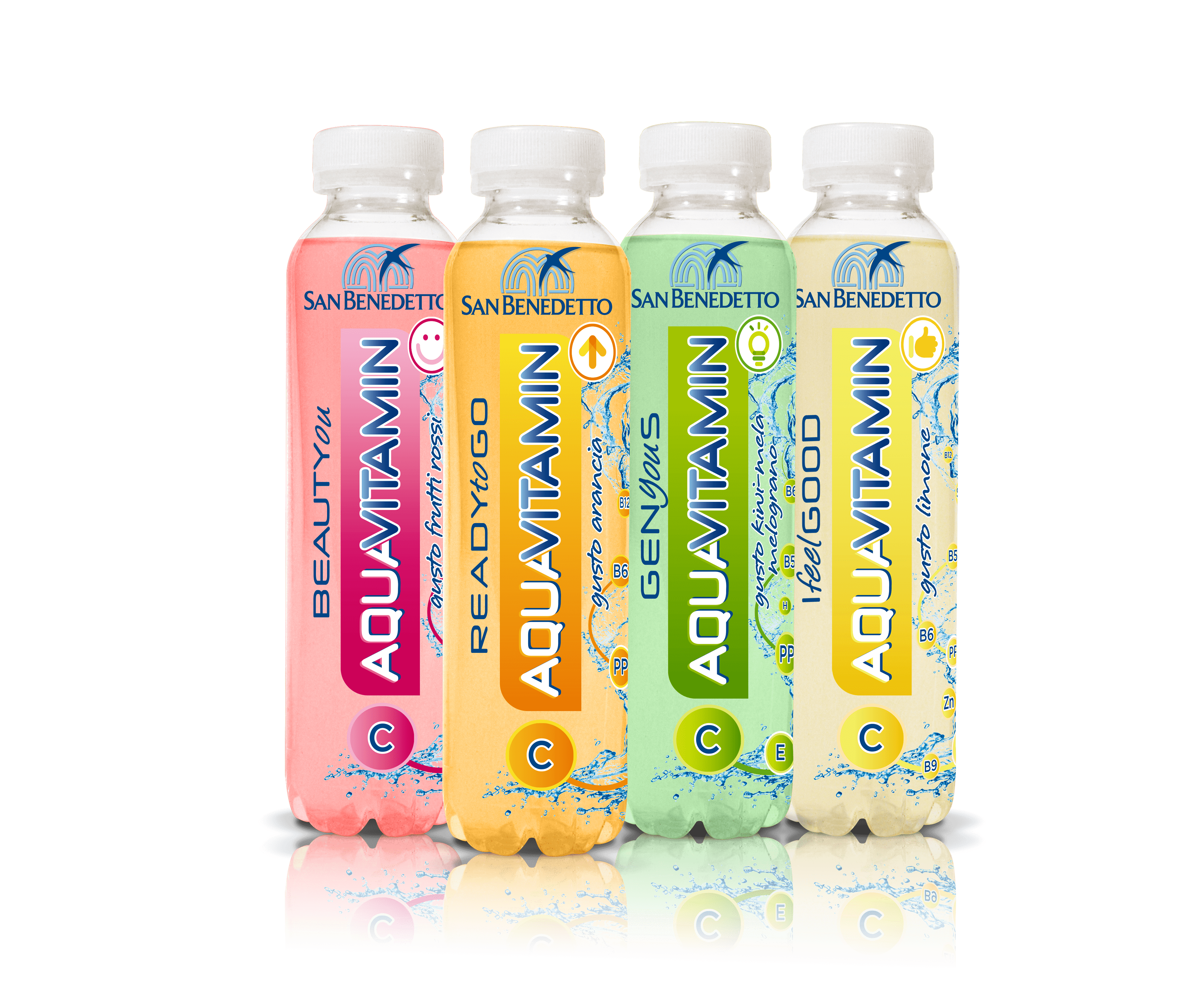 La linea “Progetto Ecogreen”, che comprende anche i formati da 1L “Easy” e quelli famiglia da 1,5L e 2L, è caratterizzata dall’utilizzo di RPET nella produzione delle bottiglie ed inoltre acquista crediti per finanziare attività sostenibili che abbattano i abbattano i gas effetto serra, in modo da compensare la CO2 eq sull’intera linea. Aquavitamin, la bibita dedicata a tutti coloro che svolgono una vita attiva, attenti al proprio benessere e con uno stile di vita giovanile e dinamico,è disponibile nel formato “slim” da 0,40L in 4 gusti freschi e dissetanti, con 4 diverse aree funzionali: BEAUTYou al gusto frutti rossi, un alleato per l’idratazione e la tonicità, GENyouS, al gusto kiwi/mela/melograno, per ritrovare vitalità ed energia, IfeelGOOD al gusto limone, un aiuto per mantenere in forma le difese naturali e READYtoGO al gusto arancia, una piacevole pausa rinfrescante per ritrovare lo sprint.