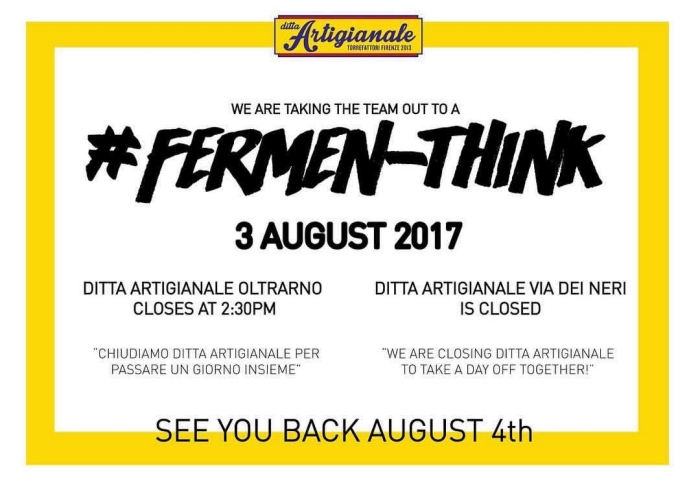 L'innovazione, le idee, una squadra giovane e motivata, il senso di appartenenza: tutto questo è Fermen Think, un'intera giornata dedicata al team building, pratica comune usate nelle mega corporation di successo – da Google a Facebook, passando per Apple – per formare lo spirito di squadra dei propri dipendenti. E questo è quanto Francesco Sanapo, pluricampione italiano di caffè e fondatore di Ditta Artigianale, prima linea di caffetterie con cucina dedicati al consumo consapevole di caffè, ha pensato per i suoi 40 dipendenti: il prossimo giovedì 3 agosto si ritroveranno tutti presso l'agriturismo Podere Castellare (a Pelago, comune in provincia di Firenze) per un'intera giornata dedicata alla costruzione di una squadra, e per sviluppare nuove idee nel mondo del caffè. Per l'occasione, e ad ulteriore riprova dell'impegno che Ditta Artigianale ripone nell'iniziativa, i tre locali del brand a Firenze (in via De' Neri, in via dello Sprone e presso il cinema La Compagnia in via Cavour) resteranno chiusi per tutto il giorno.