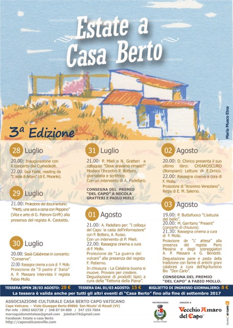 “Estate a casa Berto” , giunta alla sua terza edizione, coniuga, nei luoghi scoperti e amati dal grande scrittore e dove scrisse uno dei capolavori del ‘900 letterario italiano “Il male oscuro” , letteratura, cinema e giornalismo di qualità, per una settimana di proposte di alto profilo e utilizzando gli spazi naturali di Capo Vaticano come “agorà” di incontri culturali e umanistici tra personaggi di diversi settori .