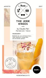 Eletto nel 2014 miglior bartender d’Italia e secondo al mondo alla Diageo Reserve World Class nello stesso anno, Claudio Peri contraddistingue tutte le sue creazioni con il giusto mix di rigore tecnico e genio creativo. Ne rispecchia lo stile anche “The Jerk Knees”, il miscelato ideato appositamente per il Tenda Bar composto da Beefeater gin, succo di limone fresco, angostura, orange bitter, semi di lavanda e ginepro. La secchezza e amarezza del gin è contrastata dalla dolcezza del ginepro e del miele, cui si aggiungono le note fresche e floreali di lavanda, per un risultato ricco di profumi e sapori che diventano sempre più intensi via via che si procede con la degustazione.