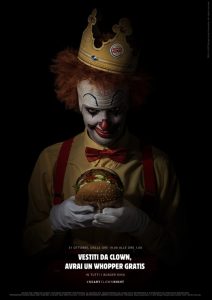 Un video forse non adatto a chi soffre di coulrofobia (la paura dei pagliacci), che conferma ancora una volta la sottile ironia di Burger King. Seguendo il filone delle iniziative ideate negli anni passati per festeggiare Halloween, quest’anno l’azienda affida proprio a dei clown il compito di spaventare i clienti collegandosi, così, al film horror più atteso del 2017, IT, che tanto ricorda la mascotte del principale competitor.