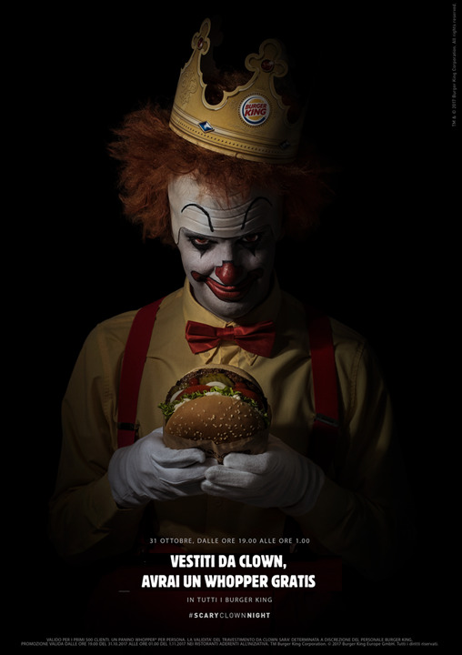 Martedì 31 ottobre dalle 19:00 all’1:00 durante la Scary Clown Night*, le prime 500 persone che si recheranno nei ristoranti Burger King vestiti da clown riceveranno in omaggio un gustosissimo Whopper. Non basterà solo una parrucca o un naso rosso per spaventare la crew di BK, il travestimento dovrà essere autentico e terrificante!