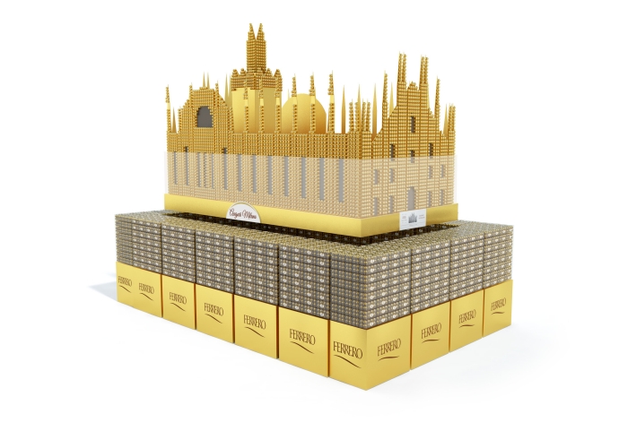A partire dal mese di dicembre sui punti vendita in tutta Italia, oltre alla distribuzione degli opuscoli nelle isole del Natale dedicate alle specialità Ferrero, verranno esposti oltre 40 monumenti (in 3D e 2D) realizzati con migliaia di Ferrero Rocher che renderanno omaggio alle principali icone dell’Italia nel mondo, dal Duomo di Milano alla Reggia di Caserta.