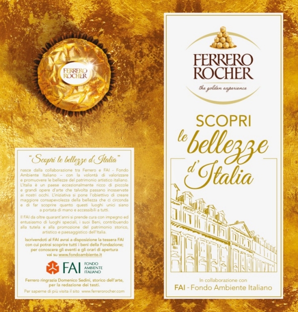 Ferrero Rocher nasce in un Paese bello e buono, ricco di tesori di cui andare fieri e vuole amplificare questo concetto andando a toccare corde emotive ed orgoglio italiano. Per questa ragione ha deciso di dialogare in modo virtuoso con il FAI - Fondo Ambiente Italiano raccontando ai propri consumatori come opera sul territorio e mostrando i magnifici luoghi di cui è promotore.