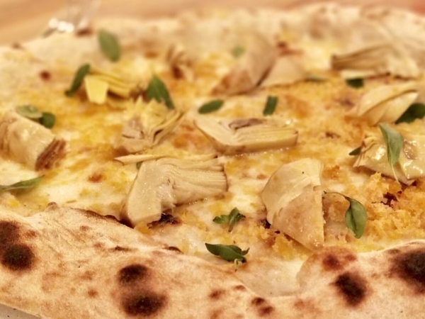 Pizza W Pino Spanu: bottarga di muggine 100% Cabras, carciofo crudaiolo, buccia di arancia essiccata - Lello Ravagnan (Grigoris)