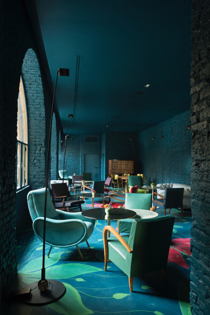 Il tratto giocoso del progetto si percepisce nelle lampade da terra, un susseguirsi di steli sottili, galleggianti ai bordi della sala come canne di bambù, e negli spazi toilette vestiti di acido pied-de-poule maschile e di gotico-romantico macramè al femminile. L’ironia più evidente è però il ribaltamento della decorazione principale: il pavimento diventa la tela di una grande motivo dipinto a mano dalla artmaker Silvia Moro, un intrico di fiori vivaci, rami e foglie che riprende il gusto di sete cinesi retrò. Sin dalla soglia del locale diventa la via da seguire per addentrarsi nel suo cuore e la firma della sua atmosfera.