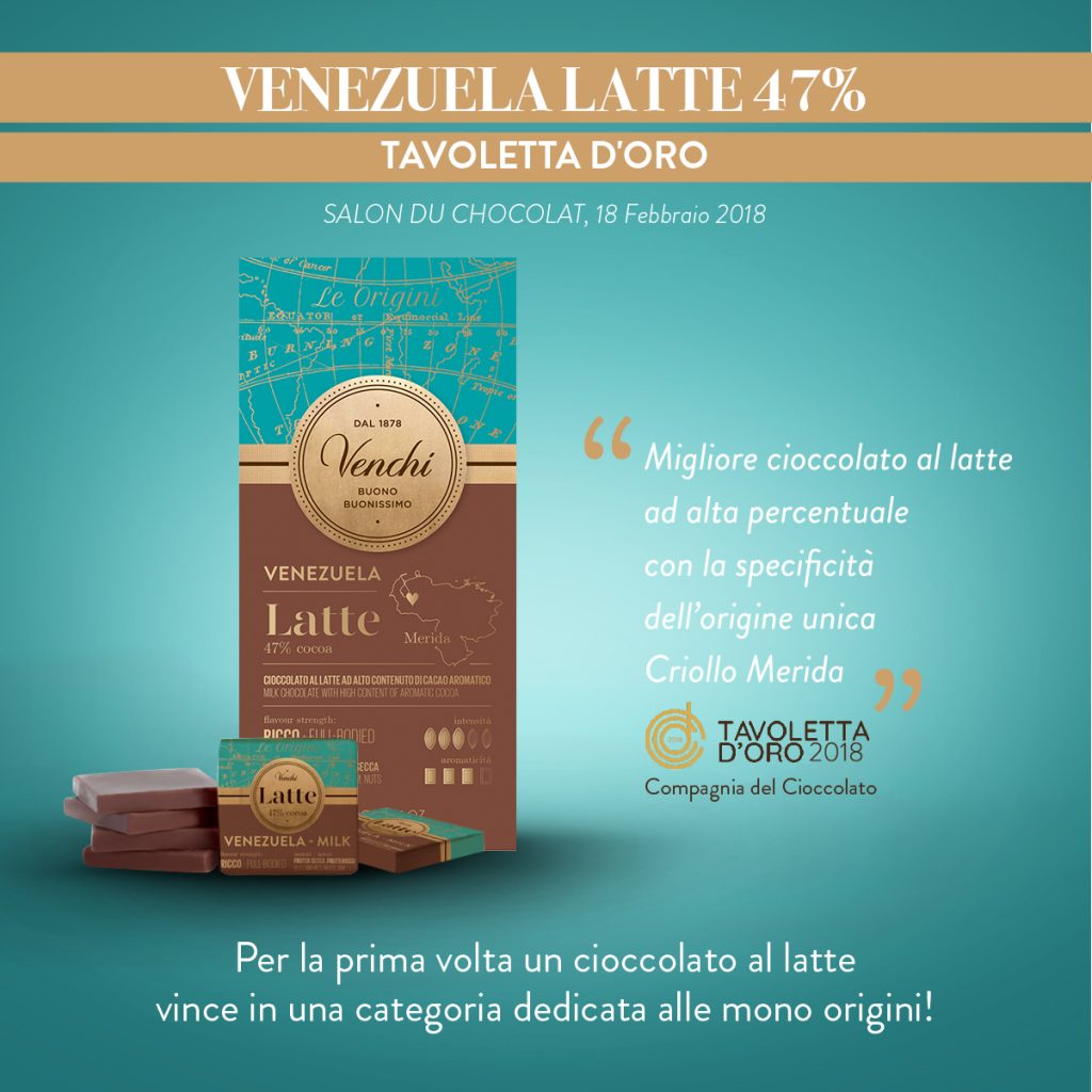 Il cioccolato Venezuela Latte 47% Venchi è stato riconosciuto come “migliore cioccolato al latte ad alta percentuale con la specificità della origine unica Criollo Merida”. È la prima volta che un cioccolato al latte vince in una categoria dedicata alle mono origini.