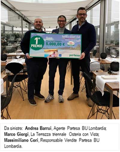 Sete di Vincere è il concorso legato al programma di fidelizzazione dei clienti Partesa, Horeca Street Club. A ritirare il voucher viaggio da 5mila euro, Marco Giorgi nella splendida cornice del ristorante al primo piano del museo La Triennale. A consegnare il premio, Andrea Barrui, Agente Partesa BU Lombardia e Massimiliano Cori, Responsabile Vendite Partesa BU Lombardia.