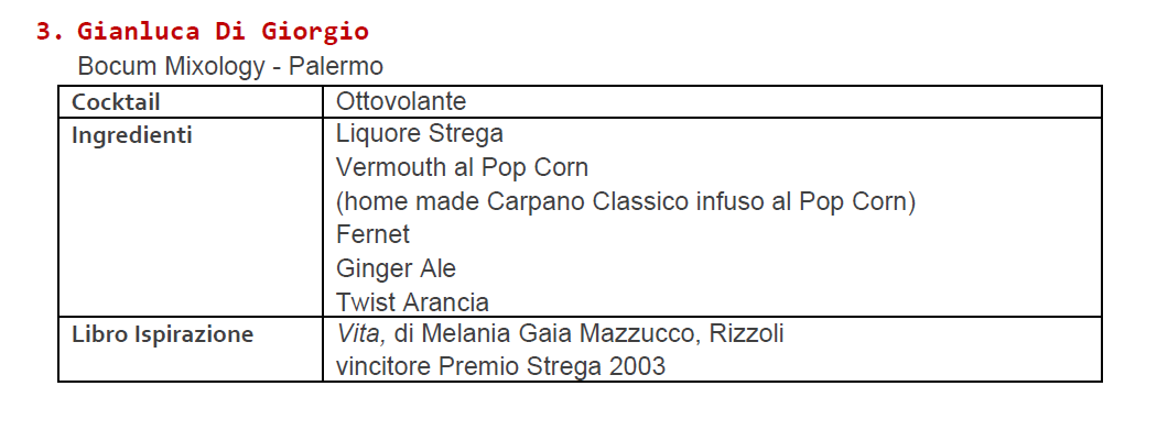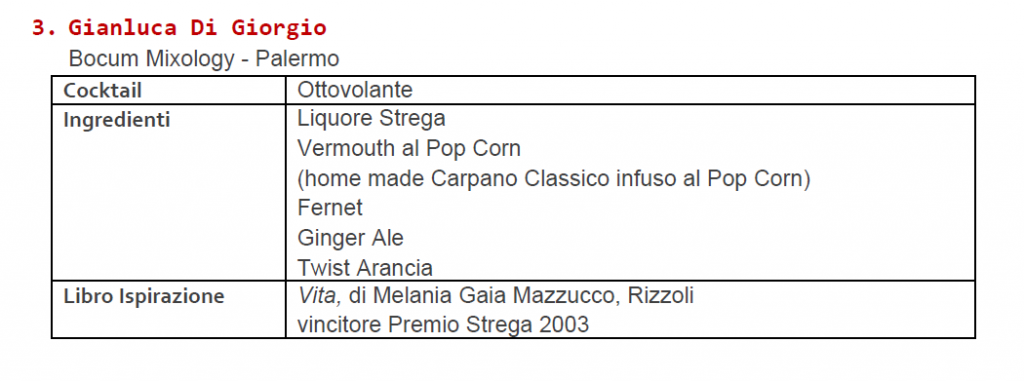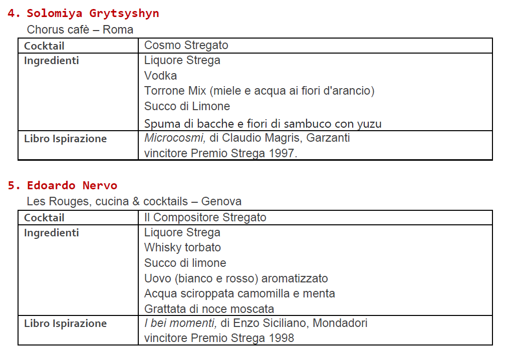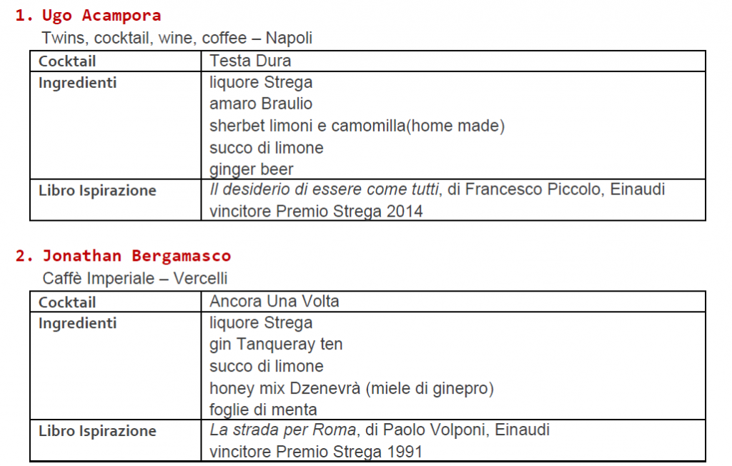 Più di 200 le ricette giunte da tutta Italia, oltre il 10 percento delle quali provenienti da barlady, con un sostanziale incremento della partecipazione femminile: la storica azienda Strega Alberti Benevento richiedeva ricette originali a tecnica libera con almeno 3 cl di Liquore Strega e ispirate a uno dei 71 libri vincitori delle passate edizioni del Premio Strega.