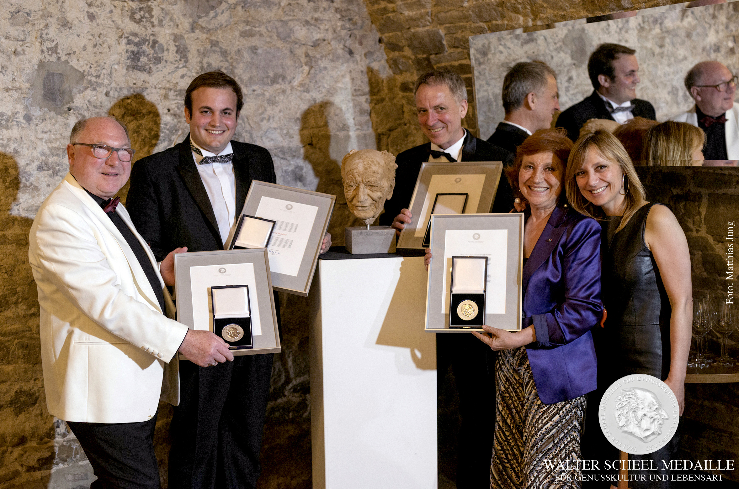 “Il mangiare e il bere avvicinano le persone. Uniscono le nazioni stabiliscono profonde connessioni fra gli esseri umani, il buon cibo ha permesso passi significativi in molte trattative fra le nazioni… Spezzare il pane con i propri ospiti, siano essi amici o estranei, è un segno inconfondibile di amicizia”. (Walter Scheel, 1991). Questa “connettività” rappresenta lo spirito del progetto europeo sostenuto dal Presidente Scheel. Assieme a Giannola e alla famiglia Nonino, simbolo dell’Arte della Distillazione della Grappa e nella tradizione della distillazione europea la medaglia quest’anno è stata conferita a José Gomez, proprietario di Joselito “il miglior prosciutto del mondo” premio speciale della Real Academia de Gastronomia 2018, a Bernard Antony Maître affineur e selezionatore di formaggi conosciuto in tutto il mondo come alchimista dei formaggi e alla famiglia Gillardeau, uno dei marchi più importanti nell'ostricoltura francese, casa fondata 110 anni fa che produce solo “speciali”, le ostriche più richieste dagli chef europei.