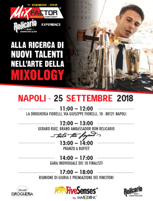 Mavi Drink, l’eccellenza italiana nella produzione di liquori e spirits, in collaborazione con Beveland Distillers, proprietaria del brand Relicario Rum, dà il via alla finale della quarta edizione del concorso “MixFactor – Relicario Experience”, alla ricerca di nuovi talenti nell’arte della Mixology. Il 27 agosto 2018, una giuria tecnica, ha selezionato i dieci finalisti che Martedì 25 settembre a Napoli, in una location d’eccezione, la Drogheria Fiorelli, si sfideranno dal vivo a colpi di shaker, nella preparazione di un cocktail sulla base di un tema che verrà svelato al momento, utilizzando gli esclusivi prodotti Five Senses. I bartender potranno scegliere la base del loro cocktail tra le versioni Superior e Supremo del prestigioso Rum Relicario, alla quale abbinare i prodotti Five Senses Premium, Five Senses Mixology e i prodotti Medulla tipici della tradizione italiana, ciascuno di loro avrà a disposizione 7 minuti per la preparazione del cocktail.