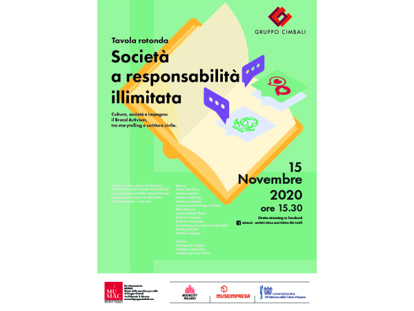 È giusto che le imprese scendano in campo prendendo posizione sui temi importanti per la collettività? Quali strategie possono adottare per trasformare i valori del bene comune da semplici slogan a realtà? In che modo possono diventare protagoniste di uno sviluppo sostenibile attraverso un’assunzione concreta di responsabilità sociale utile alle comunità? Sono solamente alcuni dei temi al centro della virtual round-table “Società a responsabilità illimitata: cultura, società e impegno: il brand activism tra storytelling e scrittura civile” in programma domenica 15 novembre 2020 alle 15.30 in diretta streaming sulla pagina Facebook di MUMAC - Museo della macchina per caffè di Gruppo Cimbali, la più grande esposizione al mondo di macchine professionali per caffè ospitata all’interno dell’headquarters del Gruppo.