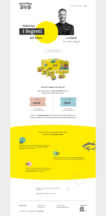 La partecipazione da parte degli utenti sarà molto semplice: il meccanismo sarà quello degli Instant Win quotidiani ai quali si aggiungerà l’estrazione finale di super premi al termine del contest. Ogni settimana, per otto settimane, sul sito web sarà pubblicata una video ricetta dello chef preparata con i prodotti Angelo Parodi e un ingrediente misterioso. Chi desidera partecipare al contest dovrà registrarsi al sito e indovinare l’ingrediente mancante per scoprire immediatamente se ha vinto. Chi avrà vinto un Instant Win, non potrà più vincerne successivamente ma, converrà comunque partecipare settimanalmente perché più si giocherà più possibilità si avranno di vincere i super premi finali, è come guadagnare ogni volta ticket di partecipazione. A più ricette con ingrediente segreto si risponde, più ticket si guadagnano per l’estrazione finale.