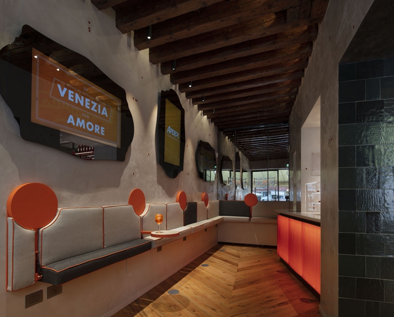 Per dare forma e natura simbolica a un luogo che si pone come punto di contatto tra passato e presente, tradizione e contemporaneità, profondità e leggerezza, Tiziano Vudafieri e Claudio Saverino hanno disegnato uno spazio che unisce le radici veneziane a una vibrante atmosfera cosmopolita. Nel progetto di interior elementi della tradizione sono reinterpretati in chiave contemporanea. Troviamo così specchi veneziani che divengono monitor digitali per condividere foto con gli altri locali Aperol nel mondo; stucchi fatti a mano e pavimenti in legno recuperato dalle “bricole” veneziane (pali di quercia che segnalano i canali navigabili in laguna) con fughe arancioni; un bancone, ispirato ai bar della metà del XX secolo, rivestito con pannelli di policarbonato riciclato stampati in 3d; panche, le cui forme classiche si combinano con tessuti dai toni neutri e dallo stile contemporaneo. In omaggio al colore iconico del marchio, sono molteplici i dettagli arancioni che caratterizzano l’atmosfera estetica del locale: dai bordi delle sedute al bagno total orange, dalle mensole agli specchi. Un vero e proprio “fil orange” unisce i diversi ambienti, conferendo al locale un tocco distintivo.