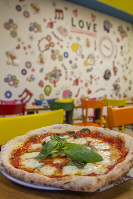 - Una Bella Margherita – Pomodoro pelato San Marzano DOP, bocconcini di fior di latte fresco, basilico fresco, olio extravergine IGP, spolverata di Parmigiano DOP