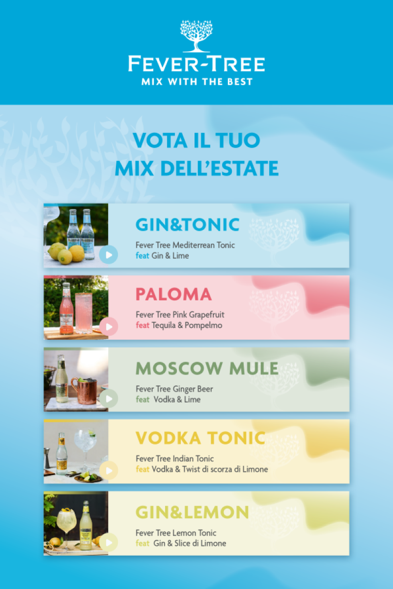 Gli amanti della mixology potranno così gustare, ascoltare e votare, scegliendo tra l’intramontabile Gin & Tonic, accompagnato dall'aromatica Mediterranean Tonic Water, il Paloma, con l'inconfondibile sapore dolceamaro della Pink Grapefruit Soda, e il rinfrescante Moscow Mule, preparato con la Ginger Beer. Gli appassionati di vodka potranno deliziarsi anche con un Vodka Tonic, servito con l’Indian Tonic Water, mentre il Gin & Lemon, esaltato dalla vibrante acidità di Fever-Tree Lemon Tonic Water, sarà l'opzione ideale per gli amanti dei sapori più frizzanti.