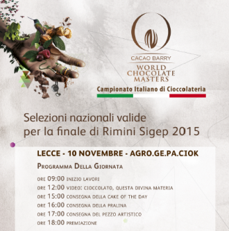 Il 10 novembre 2014 si terrà la terza e ultima tappa delle selezioni regionali del Campionato Italiano di Cioccolateria che si terrà a Rimini il prossimo 17/20 gennaio 2015, valido per l’accesso alla finale della VI edizione del World Chocolate Masters. E la sera stessa del 10 novembre saranno proclamati finalisti che si contenderanno il titolo nazionale. Il capolinea di