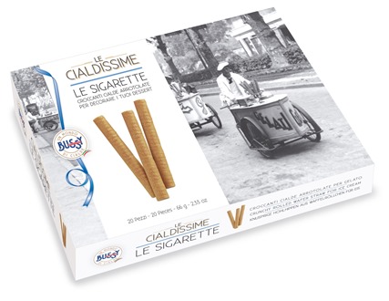 Le confezioni Bussy più rappresentantive sono quelle in metallo della linea Vintage: bellissime scatole pensate per accompagnare il consumo di gelato a casa, ma anche per essere consumate così, da sole, e perfette per un occasione regalo. Sono proposte in quattro varianti, dai semplici e croccanti Ventagli Gelato, aromatizzati alla vaniglia (in 100 pezzi), alle Piruette, cialde variegate arrotolate con interno di cacao (75 pezzi), da Le Bussine, lunghe e sottili sigarette in cialda ricoperte internamente di cacao (in 40 pezzi) ai Ciokkolini, cialde arrotolate e semischiacciate al cacao dentro e fuori.