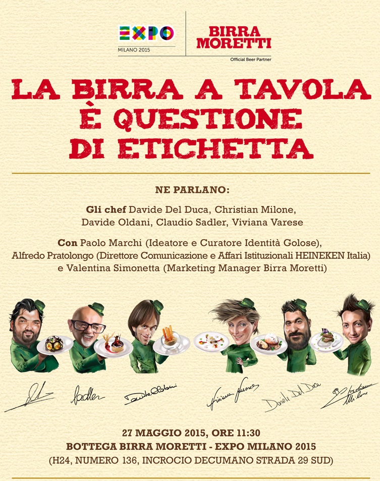 L’evento di presentazione dell’edizione speciale di Birra Moretti Ricetta Originale si tiene mercoledì 27, alla Bottega Birra Moretti in Expo. Qui, a partire dalle ore 11 e 30, sono presenti Claudio Sadler, Davide Oldani, Viviana Varese, Davide Del Duca e Christian Milone, i protagonisti della limited edition (manca solo Cannavacciuolo, impegnato con le riprese televisive). Un breve dibattito sul ruolo della birra a tavola è moderato da Paolo Marchi e Alfredo Pratolongo, Direttore Comunicazione e Affari Istituzionali Heineken Italia.