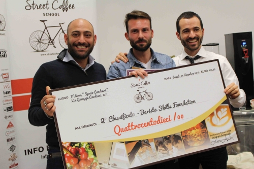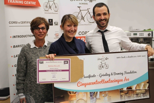 Finalmente giunge la nomina dei vincitori. Per tutti i concorrenti un diploma di partecipazione e un utile omaggio offerto da Street Coffee School. A sorpresa, l’ultimo classificato, Lorenzo Sordini, riceve anche un “maxi assegno” da 660 euro che gli dà accesso a un corso di Latte Art Foundation. Barbara Boccelli e Marco Carrieri si aggiudicano la finale a Rimini e l’assegno che dà accesso rispettivamente a un corso Grinding & Brewing Foundation e Barista Skills Foundation. Sorpresa e felicissima, Barbara ha scelto per la sua gara dei decori semplici, ma realizzati con precisione.