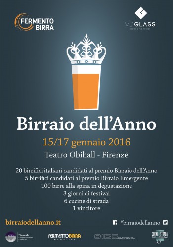 A Firenze torna uno dei premi più attesi del panorama brassicolo italiano: Birraio dell’Anno, il riconoscimento ideato e organizzato da Fermento Birra con la sponsorizzazione di VDGlass che ogni anno premia il miglior artigiano della birra italiana. Da venerdì 15 a domenica 17 gennaio 2016 sarà il teatro Obihall ad ospitare la settima edizione del premio/evento: un vero e proprio tributo alla birra artigianale italiana, un evento ricco di emozioni birrarie garantite da un’offerta ultra-selezionata composta da 100 birre artigianali alla spina, prodotte dai migliori 20 birrifici artigianali e, novità, dai 5 migliori birrifici emergenti.