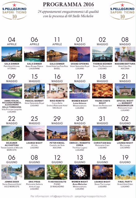 Per celebrare i suoi 10 anni, S.Pellegrino Sapori Ticino si presenta in veste tristellata. Infatti saranno tutti tre stelle Michelin i 10 chef internazionali protagonisti delle altrettante cene del ricco calendario 2016, dal 1° maggio al 19 giugno, nelle più prestigiose location del Canton Ticino, da Lugano ad Ascona fino a Vacallo.