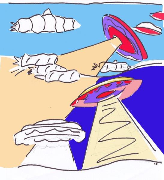 Sclavi, nato pasticcere, fa le riprese con il suo telefonino. Guarda le torte che capovolte sono diventate succulenti dischi volanti e parla con gli extraterrestri. Ci sarà un attacco alla terra, un dolce attacco. Prende il comando la crostata di lamponi ripieni di crema... è la più buona. Seguita dall’astronave a dieci piani di crema, panna e cioccolato. La torta di cioccolato comincia a tirare giù la scaletta di zucchero fatta a ricciolo, pronta per l’atterraggio. E la mimosa sta su per controllare e far luce su tutti i movimenti. Sarà una dolce invasione riservata solo agli uomini golosi. Per paura dell’attacco extraterrestre partono i cannoli missili, le bombe di cioccolato e i bignè a lungo raggio, i coni supersonici pieni di gelato pronti per sganciare le bombe di zucchero. Ma alla fine tutti vissero dolci e contenti.