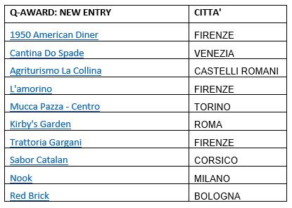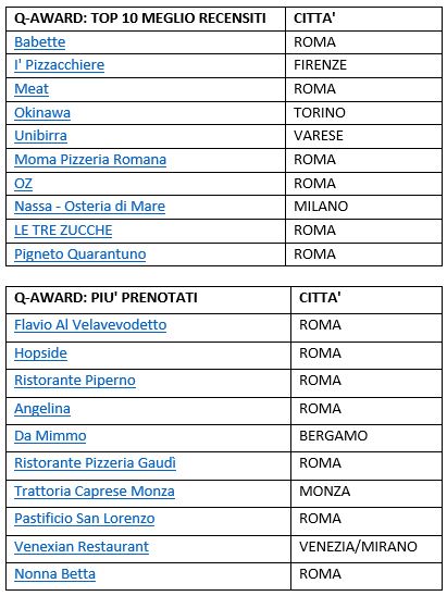 Più prenotati - Nella classifica Q-Award si evincono anche dati relativi ai 10 ristoranti più prenotati dagli italiani. La capitale domina anche in questo caso con il 70% delle preferenze. Sul podio, infatti, tre ristornati romani, Flavio Al Velavevodetto nel quartiere Testaccio, Hopside in quello Ostiense e Ristorante Piperno nel centro storico della città. La cucina tipica italiana è la preferita non solo a Roma, ma anche nelle città minori: il ristorante Da Mimmo tra le mura bergamasche di Città Alta e la Trattoria Caprese a Monza catturano la curiostà degli utenti, collocandosi in cima alla classifica delle prenotazioni.