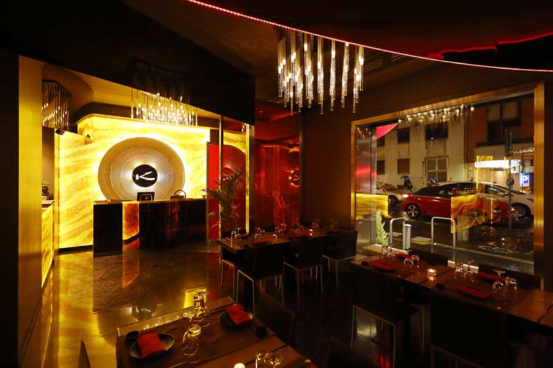 Arrivando al piano sottostante si nota un cambiamento totale di rotta; il luogo diventa una sorta di foodclub, audio curato potente e di qualità ma sopratutto la sensazione di trovarsi non nel solito piano interrato di secondo ordine ma al contrario uno spazio ambito (quasi un grande privè di 70 posti)i posti a sedere sono articolati tra sedute a divano in alcantara in tutta altezza con schienali sagomati in stile seventy e sedute a sedia contrapposte di colore bianco. L'ambientazione decisa e completamente differente dal resto del locale è identificata anche attraverso la paretre effetto canneto di bambu verde vero distribuito con alle spalle un effetto a specchio. Il soffitto color oro satinato è attraversato da diversi incroci luminosi in rilievo con alloggiate strep led. Questo spazio diventa anche a livello gestionale interessante per eventi e serate esclusive visto il caratttere diverso e l'ambientazione molto intima; nella sua totalità Kanji Light ospita 180 persone a cena suddivise tra le differenti zone con diversi approcci sensoriali e di consumo.