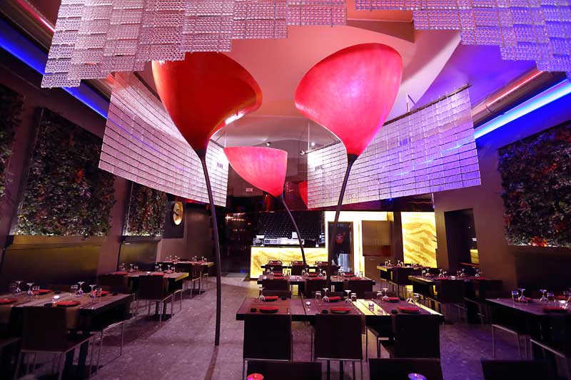 Dopo aver percorso questo sentiero ipotetico si arriva nella grande zona centrale dove una volta chiude lo spazio, cambia la pavimentazione effetto ciotolo in gres e la sensazione è quella di trovarsi in un vecchio cortile delle case milanesi, dove tre enormi fiori sono cresciuti un po' troppo e ci fanno sentire bambini. Questo gigantismo irriverente è contenuto formalmente da tre tendaggi rigidi appesi realizzati con formelle di vetro, queste ultime diventano degli sceen riflettenti le luminosità colorate e bianche delle varie sorgenti illuminanti. Il verde verticale si appropria delle superfici delle finestre esistenti ed il tutto rende una percezione surreale ma calda e avvolgente ma soprattutto mai di disturbo per chi cena al proprio tavolo. Una parete composta da scatole chiuse e aperte in ferro grezzo divide la sala tatami, all'interno pareti rosse materiche con feritoie a specchio sono sormontate da una installazione a soffitto realizzata da Anna Patrucco (architetto artista) realizzata con il salice intrecciato, una sorta di portico naturale interno. Scendendo il vano scala si è accompagnati dalla presenza dei sushi chef e da una installazione luminosa autocostruita.
