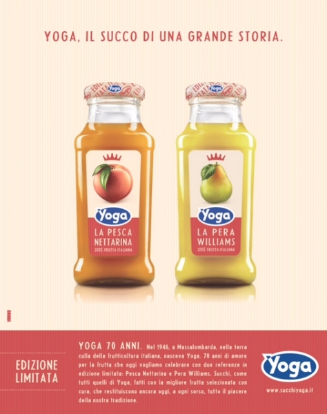Lo storico compleanno di Yoga merita l’esaltazione dei successi recenti, ma anche la valorizzazione delle origini. Proprio per questo i due nuovi succhi di frutta Yoga Pesca Nettarina e Pera Williams,oltre ad essere prodotti esclusivamente con le tipiche varietà dell’Emilia-Romagna, contengono solo frutta, senza aromi, e zucchero semplice come nella ricetta originale. Anche le etichette delle bottiglie da 200 ml sono vintage, con un stile elegantemente retrò e colori storici di oltre cinquant’anni fa.