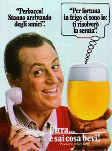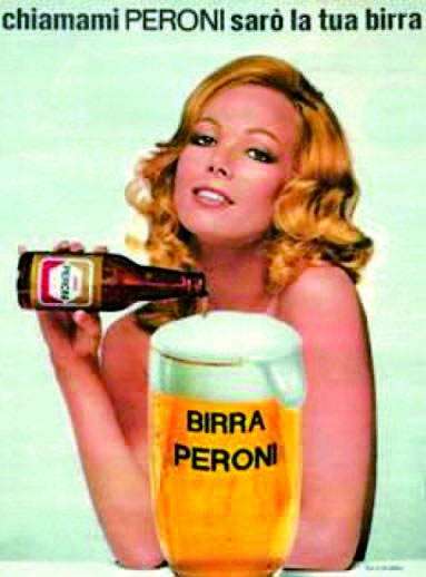 comunicazione, fin da allora, con lo slogan: “La dieta di bellezza: un bicchiere di birra al giorno” mentre gli uomini si attirano sfruttando il doppio senso della “bionda”. L’indimenticabile Solvi Stubing (“Chiamami Peroni sarò la tua birra”) è stata seguita da una lunga fila di bionde, da Milly Carlucci a Philippa Lagerbach a Jennifer Driver. Schema rotto per un momento dalla discesa nell’arena di un più ecumenico (e carismatico) Renzo Arbore (“Birra... e sai cosa bevi! Meditate, gente, meditate”). In anni più recenti si è puntato sui giovani e nasce il binomio birra-musica, sempre più protagonista delle campagne, in tv ma soprattutto sul web.