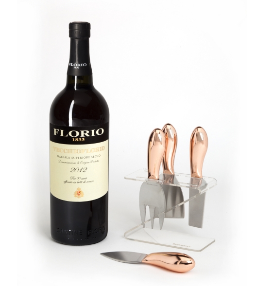 Florio invece festeggia il Natale 2016 con un nuovo elegante Pack Vecchio Florio realizzato in collaborazione con Brandani, un regalo originale e ricco di stile, perfetto per le tavole di Natale e non solo. Un set di coltellini da formaggio firmati Brandani, in acciaio inox e impugnatura ergonomica, dal design moderno ed essenziale, realizzati in un caldo e lucente color oro rosa. Quattro coltellini adatti per formaggi duri e stagionati e per formaggi più morbidi, oltre ad un’utile forchettina, perfetti per servire un aperitivo di Natale insolito o per un fine pasto elegante, grazie anche alla versatilità del marsala Vecchio Florio.