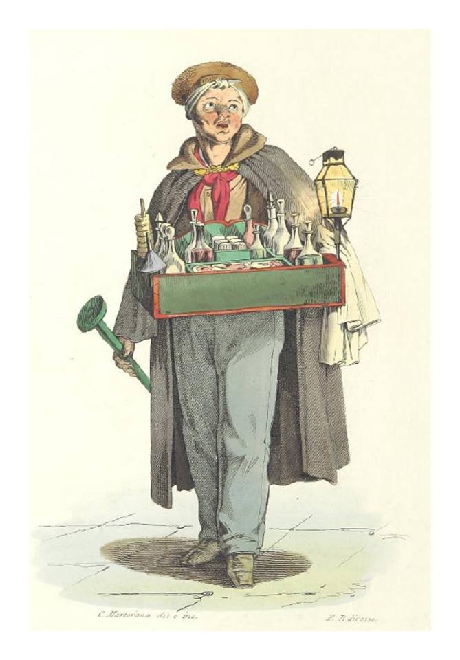Questo personaggio era solito lavorare dalle 19 del pomeriggio sino al mattino seguente, offrendo ai suoi clienti per strada un bar all’aperto. Aveva appesa al collo una cassetta nella quale allestiva il suo bar ambulante. All’interno vi sistemava liquori, distillati, rosoli, mistrà e le "prese", che erano i bicchierini di ceramica dove serviva i suoi clienti (bicchieri dai quali deriva la frase "a pres r’anns"). Oltre che a servire da bere, aveva anche dei tarallini o confetti per far stuzzicare i suoi clienti.