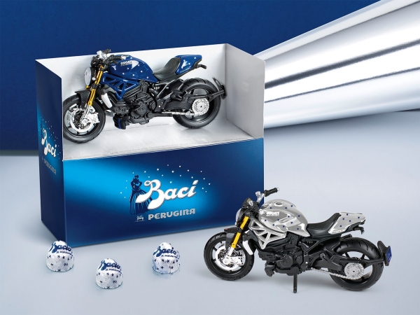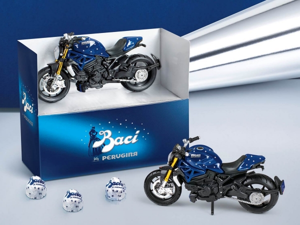 Il modellino Ducati Monster Baci Perugina è il regalo perfetto pensato non solo per gli appassionati dello storico marchio di motocicli ma anche per i profani, incuriositi dal mondo dei motori su due ruote. Inoltre, il prodotto si rivolge ad un pubblico trasversale, non solo adulti, ma anche ragazzi e bambini, ai quali si desidera donare un piccolo pensiero unito alla bontà e alla qualità dei Baci Perugina. L’edizione speciale di Baci Perugina è disponibile nei migliori Bar-Pasticcerie nella confezione da 14 praline.