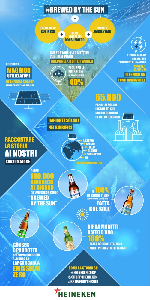 Con 65.000 pannelli fotovoltaici installati sui tetti dei propri birrifici in tutto il mondo, tra Italia, Olanda, Belgio, UK, Austria e Singapore, HEINEKEN è leader a livello mondiale, tra le aziende birrarie, nell’uso di energia solare. Al fotovoltaico è dedicato il progetto globale “Brewed by the Sun”, che ha un ruolo cruciale per il raggiungimento dell’obiettivo di ridurre le emissioni di CO2 in produzione del 40% entro il 2020. Al progetto è dedicata una sezione sul sito HEINEKEN.