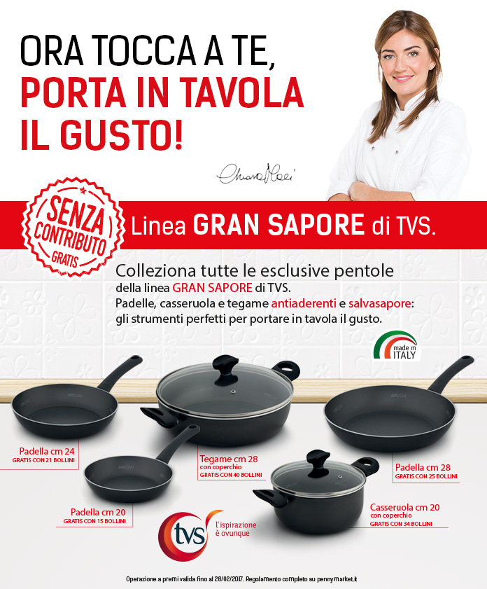 La raccolta prevede la consegna di un bollino per ogni 15 euro di spesa con Penny Card e permette di ricevere, gratis senza contributo, una pentola della nuova serie “Gran Sapore” che comprende una casseruola con coperchio, un tegame con coperchio e tre padelle di diverse dimensioni (20,24,28 cm).