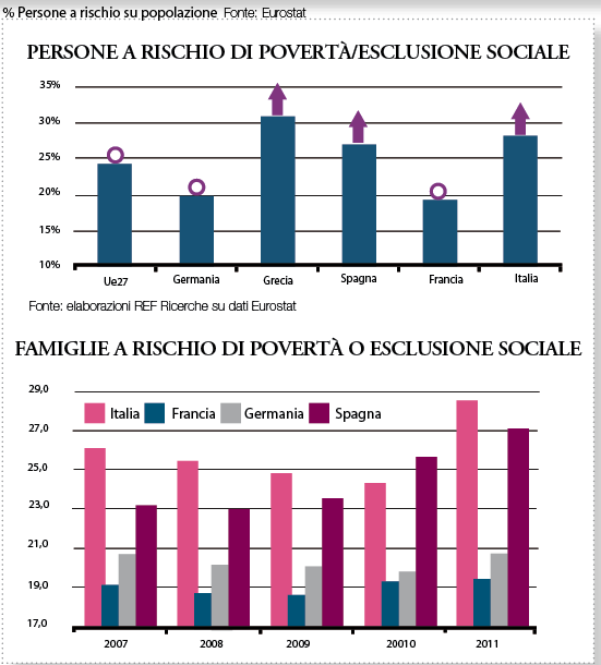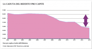 La pressione fiscale si attesta al 44%, la diminuzione del reddito disponibile reale nell’arco di 6 anni supera il 10% e il 28% delle famiglie è a rischio povertà, mentre sono 3 milioni gli italiani che non possono permettersi consumi di carne e si vedono quindi costretti a ridurre l’apporto proteico nella loro dieta. E si accentua in forma preoccupante il divario sociale che contrappone gli italiani poveri (e sempre più poveri) agli italiani ricchi, ricchissimi, praticamente nababbi. Insomma, un avvitamento economico e sociale che non lascia attualmente molto spazio a prospettive più rosee.