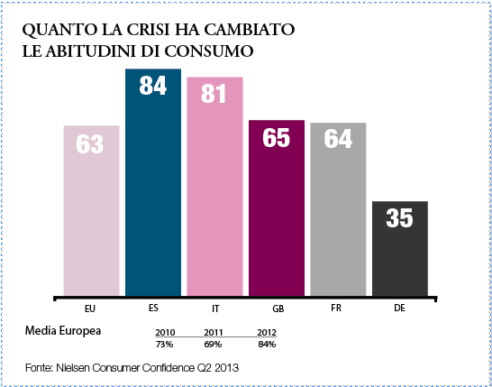 È l’81% degli italiani ad ammettere di aver cambiato abitudini alimentari a fronte di una media europea del 63%. Insieme agli spagnoli (84%) siamo in questo senso i più “rivoluzionari”. Perché la crisi ci ha condizionato pesantemente.
