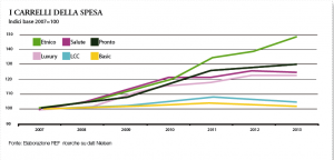 Il risultato è che il 54% compra solo l’essenziale, il 30% ha addirittura ridotto gli acquisti, mentre il 21% è passato a marchi più economici. Segnali preoccupanti, certo, che però presentano un risvolto tutto sommato positivo: questa maggiore oculatezza ha portato a ridurre gli sprechi in maniera significativa: 50 chilogrammi in meno pro capite dal 2006 al 2012. A sorpresa, o quasi, tra le vittime illustri di questa accresciuta attitudine al risparmio è il carrello basic che flette dell’1,3% nel suo complesso, con punte dell’11,2% per il pane e del 6,1% per l’olio extravergine. Le categorie anticicliche, tuttavia, ci sono. Come il cibo etnico, ad esempio, che cresce del 6,4% o il segmento benessere con il suo + 18,6%. E su questo pare che gli italiani stiano prendendo posizione: il 67% ha infatti ridotto il consumo di alimenti con troppo sale o troppi grassi e il 14,5% ha acquistato prodotti specifici per le intolleranze.