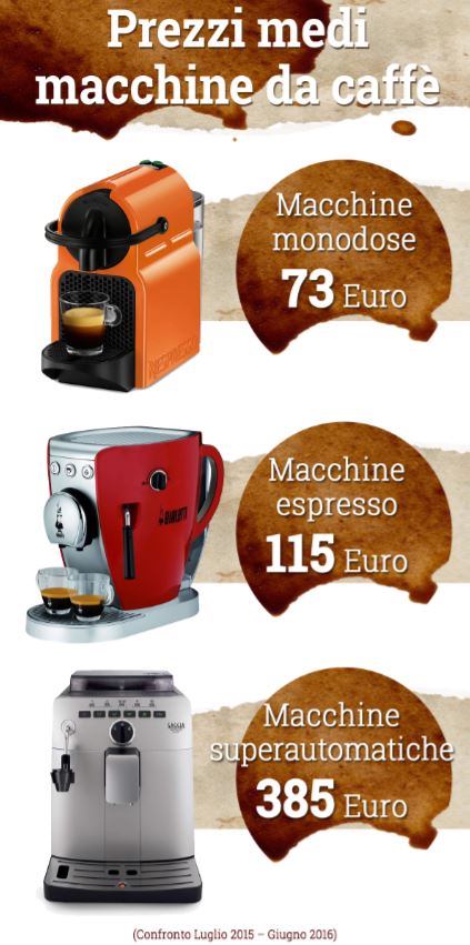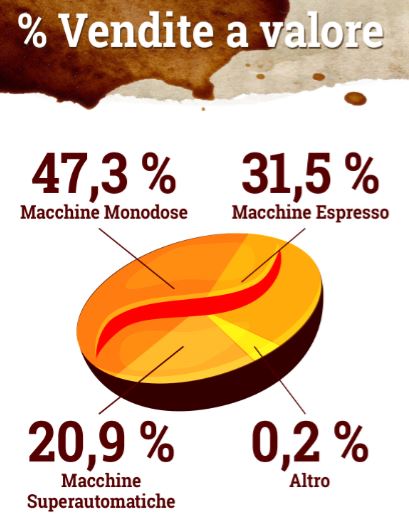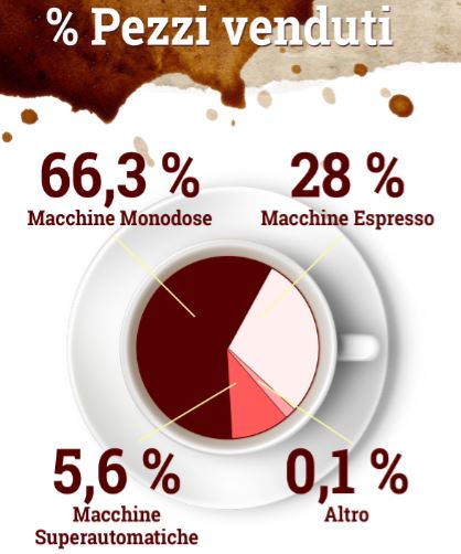 Sono i dati di Monclick e di GFK a confermare il trend di crescita del settore delle macchine da caffè per uso domestico in Italia. Secondo GFK, il comparto è dominato dalle macchine a capsule Single Serve Espresso o monodose, che a giugno 2016 hanno rappresentato il 66,3% delle unità vendute e il 47,3% del valore delle vendite totali del mercato. Si tratta di un segmento che continua a crescere in maniera sostenuta, infatti rispetto a luglio 2014 registra un aumento del 13,8% sui pezzi venduti e del 7,9% a valore. Questa categoria registra il prezzo medio più basso delle macchine da caffè per uso domestico: 73 euro, in calo del 5,2%. Questo fattore ovviamente ha contribuito alla maggior diffusione di questa tipologia di macchine nelle cucine degli italiani.