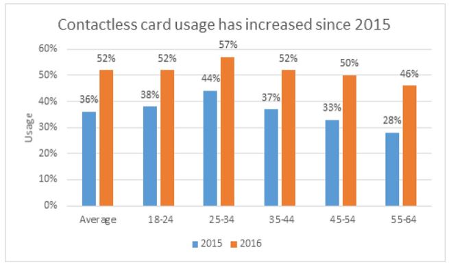 LA CRESCENTE DIFFUSIONE DEL CONTACTLESS - Sono oltre 165 milioni le carte contactless in circolazione in Europa, a cui si vanno ad aggiungere 3,4 milioni di terminali abilitati al pagamento mediante tecnologia NFC. Secondo il Digital Payments Study 2016 di Visa, il loro utilizzo per i pagamenti è passato dal 36% del 2015 al 52% del 2016. Si tratta di un trend osservabile non solo tra i più giovani consumatori, più esperti nell’approccio alle nuove tecnologie. Il contactless, infatti, è in crescita presso tutte le fasce di età e registra l’aumento più sostenuto nella fascia dei 55-64enni, che ha assistito a una crescita del 64% dal 2015.