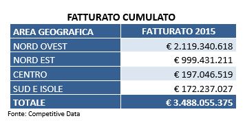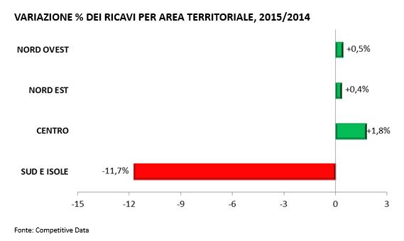 I ricavi complessivi rimangono sostanzialmente stabili (-0,2%), con le regioni del Centro Italia che mostrano la crescita maggiore, +1,80%, mentre risultano più lievi le crescite delle aziende del Nord Est (+0,36%), e Nord Ovest (+0,45%), in forte calo Sud ed Isole (-11,73%).