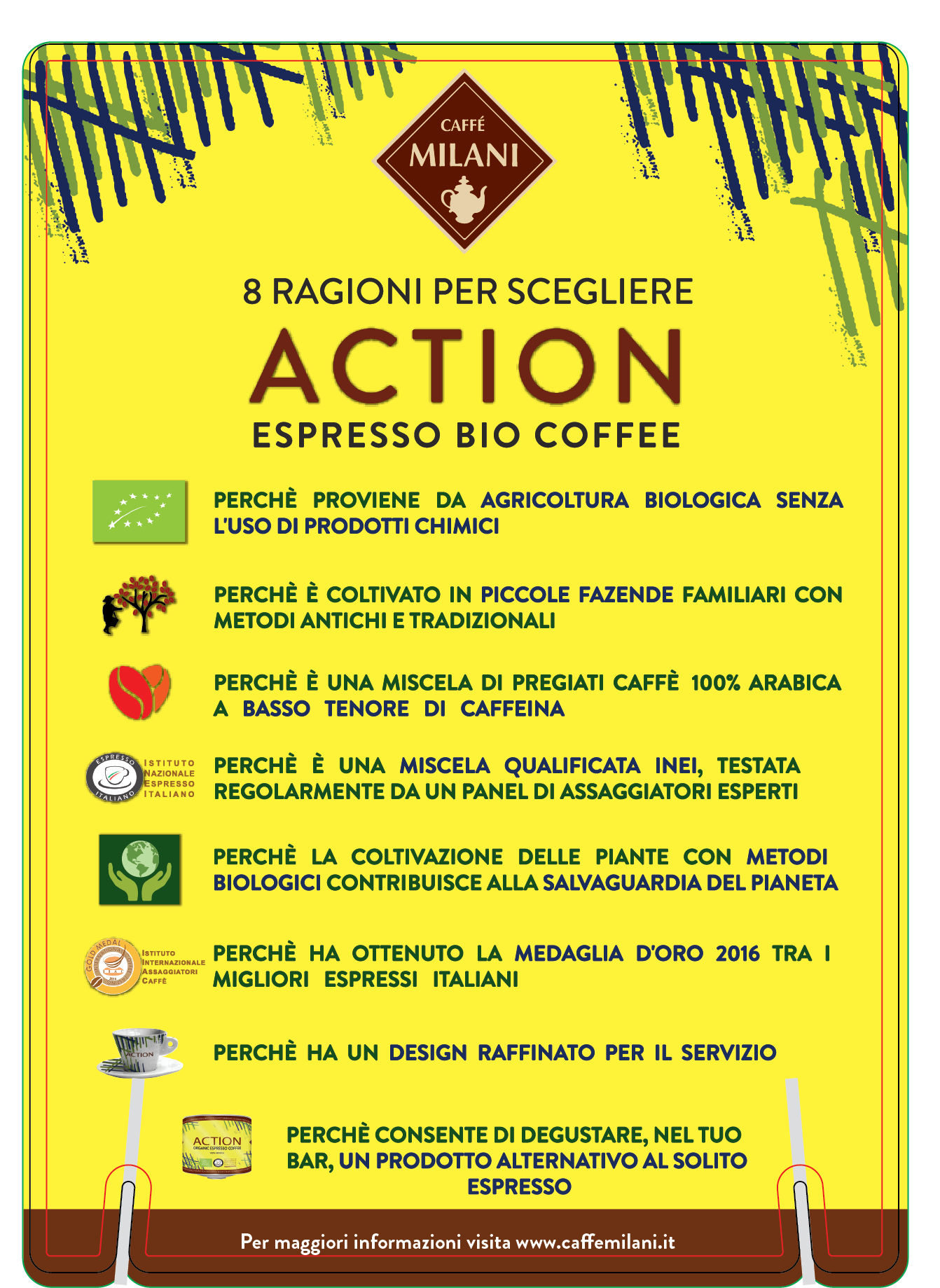 Un trend positivo da cogliere, offrendo Action Espresso Bio di Caffè Milani e ponendo bene in evidenza l’espositore con i “buoni motivi” per chiederlo: in tazzina, alla sicurezza di un prodotto naturale, si unirà il piacere di un gusto intenso e piacevole. Un’esperienza positiva da ripetere.