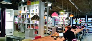 Magazzino e Box. Ecco l’esempio perfetto di come gli spazi della nuova contemporaneità uniscono diversi servizi e si propongono come contenitori di funzioni diverse. Uno spazio ibrido in cui poter mangiare e bere, leggere ed acquistare, incontrarsi e lavorare. Il design è decisivo in spazi con diverse funzioni, proprio perché diventa più complesso unire i differenti servizi che costituiscono ambiti eterogenei. Come sempre è importante rendere lo spazio omogeneo e confortevole. Gli arredi della libreria sono bianchi, semplici, ed aderiscono alle pareti bianche dando risalto ai libri. I grandi tavoloni sociali per lavorare e leggere sono di legno con sedie colorate e tutte diverse; qui troviamo l’aspetto caldo in materiali e colori. L’intervento è stato progettato in maniera intelligente, con impianti a vista senza controsoffitti e pavimento economico e durevole. Le lampade sono di design, tutte diverse nei colori e posizionate a diverse altezze come palloncini colorati. Altra nota di colore sono alcune pareti che segnano qualche funzione o fanno da retro a desk. C’è un elemento che accomuna tutti questi spazi, ed è la diversificazione negli arredi: maggiori sono i servizi e maggiori sono gli utilizzi dello spazio che deve trasformarsi in maniera flessibile. Diverse tipologie di sedute caratterizzano questi locali rendendoli comodi sia per chi va a bere una tazza di the sia per chi va a studiare o lavorare. Quindi uno spazio con più funzioni deve prevedere una grande diversificazione di arredi e scenari in modo da poter soddisfare al meglio e con comfort i diversi modi di usufruire dello spazio.