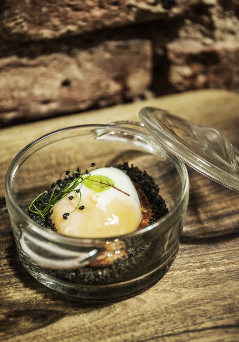 Uovo cotto a bassa temperatura servito su una terra iberica a base di chorizo, carbone vegetale e pan grattato. Un piatto che soddisfa anche l’occhio.