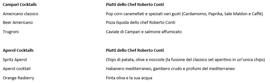 Cocktail e alta cucina - Tommaso Cecca e lo chef Roberto Conti collaborano da quasi 10 anni alla definizione del gusto dell’aperitivo attraverso il loro lavoro presso il Trussardi alla Scala, all’inizio le due cose sono state tenute separate per difendersi dalla confusione che si era creata nel mondo dell’aperitivo, oggi con questo progetto si vuole elevare il concetto di aperitivo fondendo finalmente cocktail d’autore e alta cucina imponendosi con delle performance ben chiare a marchio milanese Campari