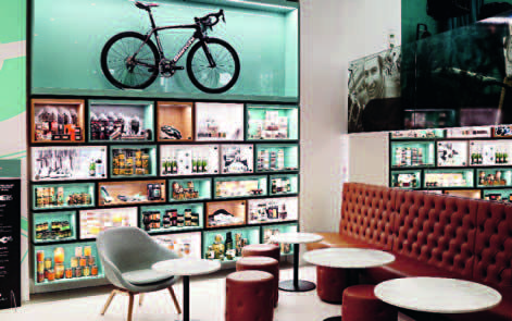 Il locale si presenta con queste parole: “Bike Shop e Officina - Uno spazio per chi ama le due ruote. Oltre alle sue specialità enogastronomiche, il Bianchi Café & Cycles ospita anche uno showroom e un’officina. Qui, i ciclisti e gli appassionati possono scoprire e acquistare gli inconfondibili modelli firmati Bianchi o affidare le proprie bici a esperti del settore per qualsiasi intervento tecnico di manutenzione o riparazione.” Questo è uno spazio ibrido, progettato per raccontare una storia, quella del marchio Bianchi (fondato nel 1885). Tutti gli elementi che lo compongono sono tasselli di un’esperienza legata alla storica casa e al mondo delle biciclette. 600mq di immagini e pezzi che scrivono la storia del ciclismo italiano: Fausto Coppi, Girardengo, le biciclette di Felice Gimondi e Marco Pantani, entrambi vincitori di Giro e Tour. I colori dello storico marchio di biciclette Bianchi – il bianco e il celeste – si alternano nel locale in superfici e dettagli. La brandizzazione del locale è sviluppata nella grafica con la grande scritta Bianchi che decora una parete, nel colore delle superfici verticali, negli arredi che riprendono un gusto anni 50. Il terzo elemento cromatico e materico è il legno, vintage e caldo, presente negli arredi ma anche nella scelta cromatica della pelle del divano capitonné. Il concept design italiano è già presente all’estero, in Svezia e in Giappone, ma quello a Milano è il primo in Italia. Bianchi Café & Cycles è aperto dalla colazione alla cena e il suo layout si articola a seconda dei servizi: infatti non è solo un bar ristorante ma è anche uno showroom di biciclette, ciclofficina, shop che propone sia prodotti legati al marchio che prodotti culinari alto di gamma made in Italy. Ci sono anche aree come lounge e dehors. In questo spazio le biciclette e i prodotti food sono sullo stesso piano, sono esposti, illuminati e posizionati in cornici come in un’oreficeria.