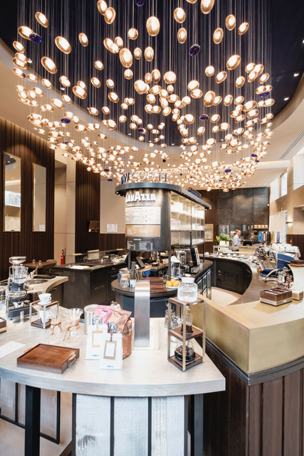 Il bar è diviso in quattro aree che esprimono le varie possibili esperienze che fanno capo al mondo del caffè, disposte intorno a un grande banco centrale di forma ellittica, con stile e colori che richiamano la materia prima. Di grande impatto è lo chandelier situato sopra al banco, ideato come elemento scenico finalizzato a enfatizzare la magia del caffè. La forma complessiva rappresenta un grande chicco di caffè composto a sua volta da 640 chicchi di due dimensioni.